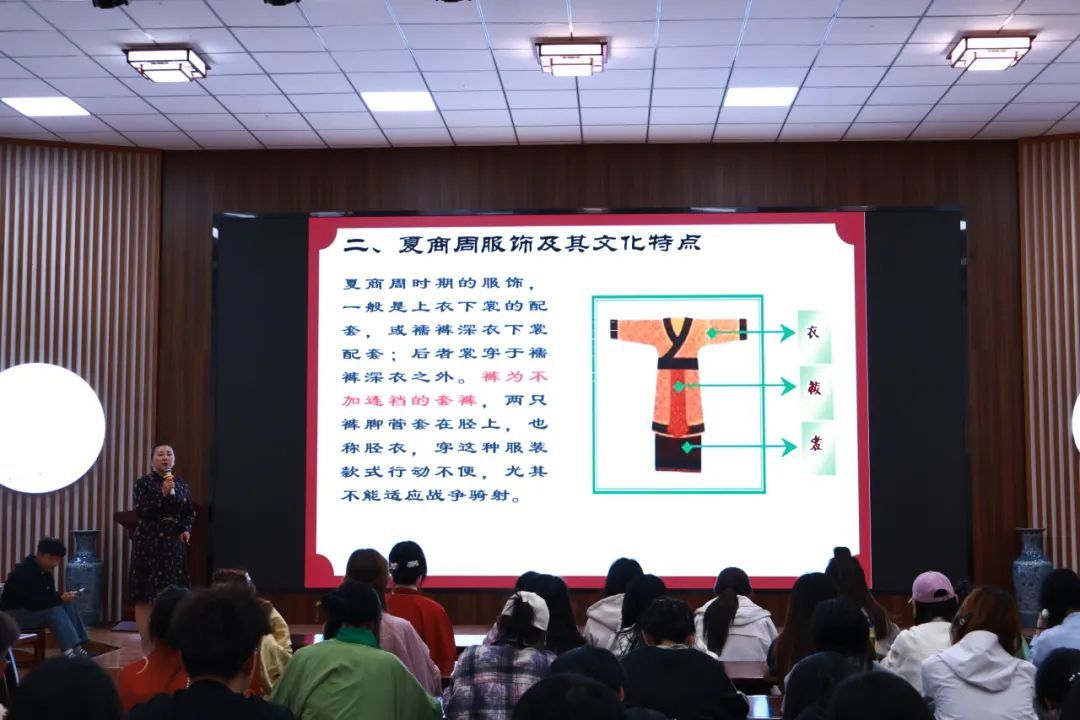 本次中华传统服饰文化国学体验课系中国语言文学学院美育实践系列课程之一,于2025年5月28日晚20:00在文科四号楼国学讲堂开授。此次体验课围绕中华传统服饰文化展开,由我院古代文学教研室主任李梅老师主讲,来自各学院50余名学生参与其中。