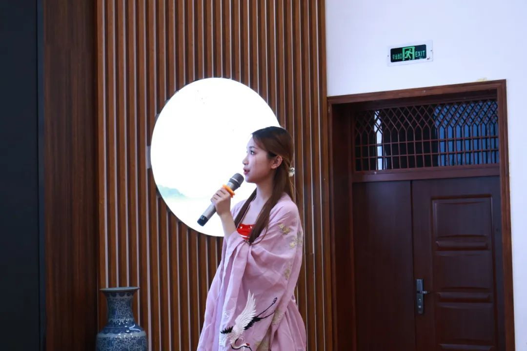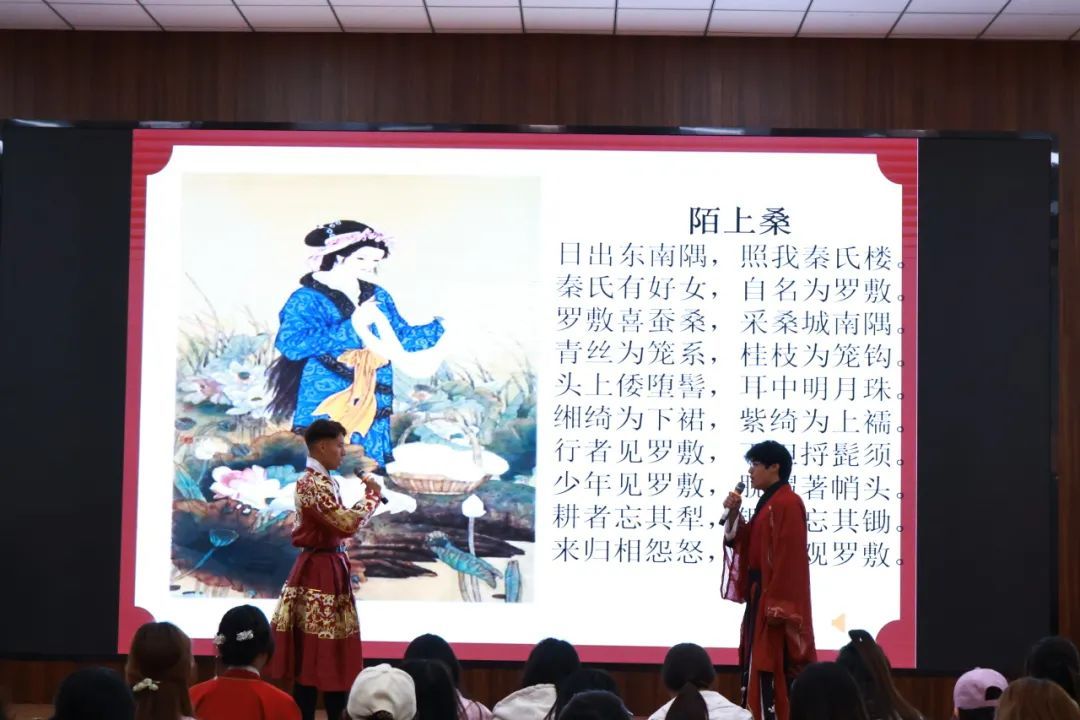 在李梅老师讲解的过程中,同学们依次上台进行诗歌朗诵及讲解,在诗歌中深入感受中华民族五千多年的衣冠文明史。先由两位同学为大家讲述了《声子失礼》《田恬的故事》两则与服饰礼仪文化相关的故事。接着同学们朗诵了先秦的《关雎》《子衿》,汉乐府的《陌上桑》,曹操的《短歌行》和李清照的《如梦令·昨夜雨疏风骤》。